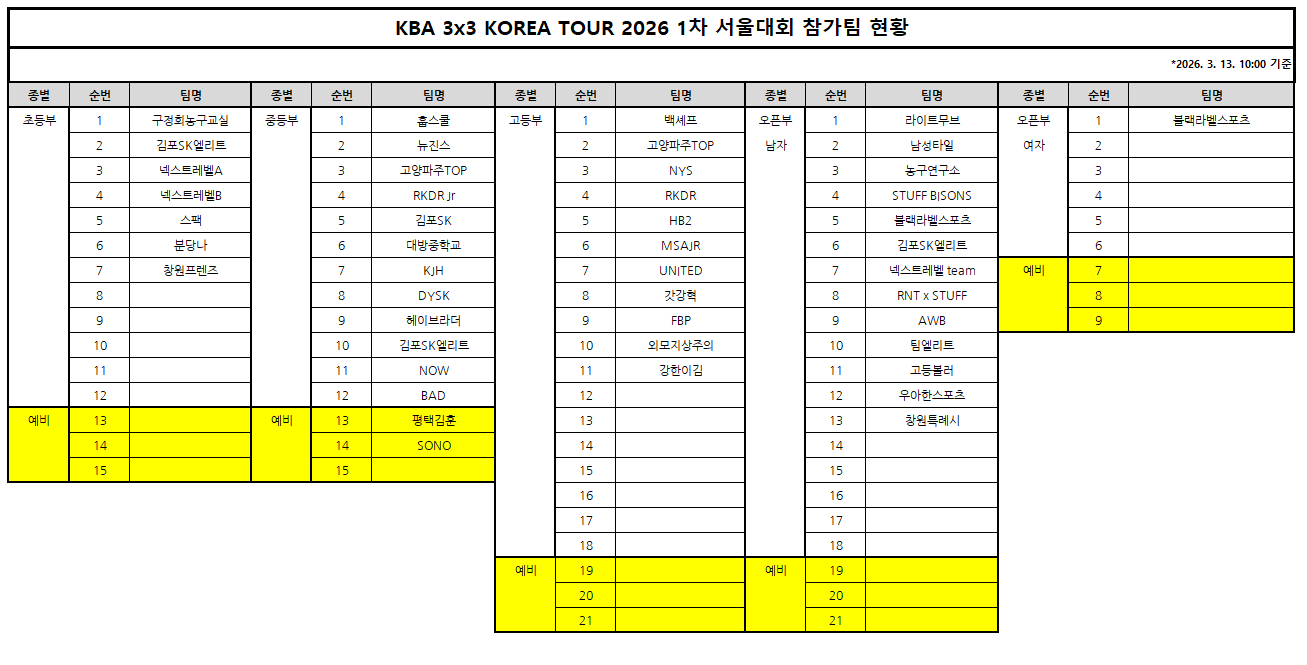 [안내] KBA 3x3 KOREA TOUR 2026 1차 서울대회 참가 팀 현황(2026. 3. 13.)