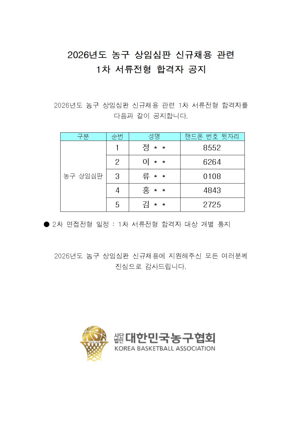 [공지] 2026년도 농구 상임심판 신규채용 관련 1차 서류전형 합격자