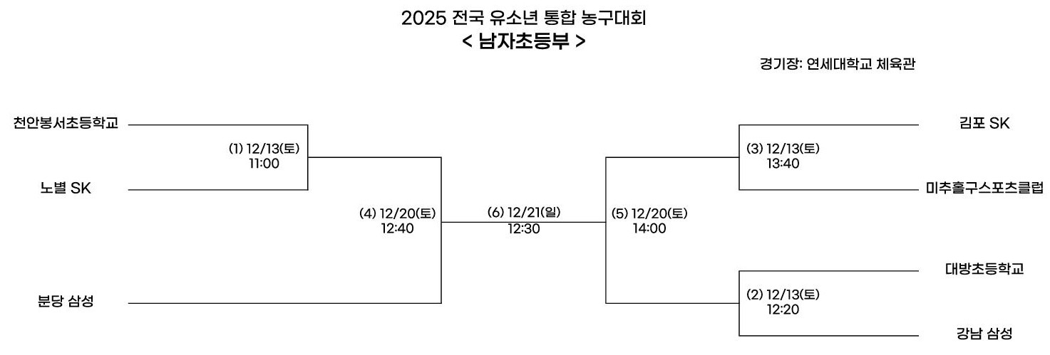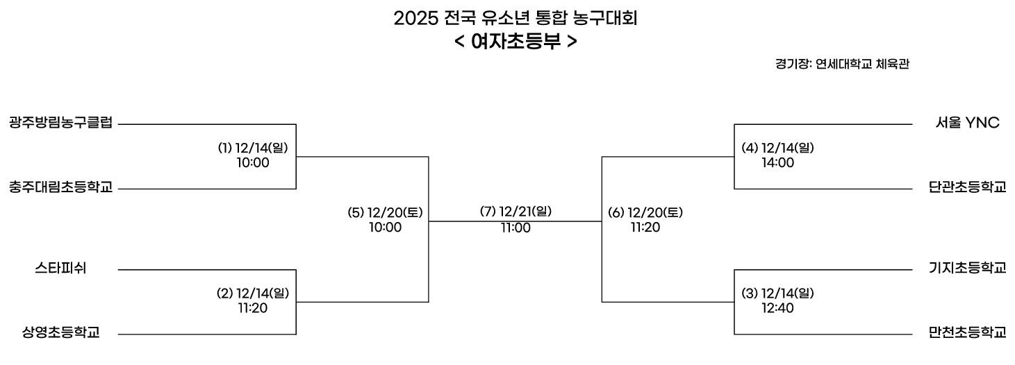 [안내] 2025 전국 유소년 통합 농구대회 대진표 작성일 2025-12-08 조회수 179 페이스북 공유하기 2025 전국 유소년 통합 농구대회와 관련하여 여자초등부와 남자초등부 대진표 안내드립니다. 각 팀에서는 참가요강(선수검인 등) 및 유니폼 규정 등을 숙지하여 주시기 바랍니다.