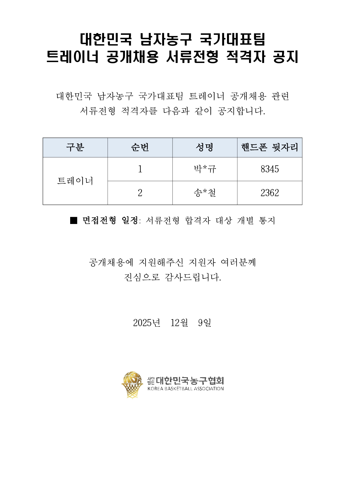 [공고] 트레이너 공개채용 서류전형 적격자 발표