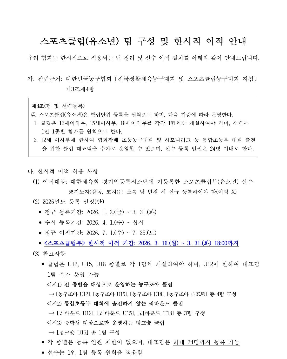 [안내] 스포츠클럽(유소년) 팀 구성 및 한시적 이적 안내