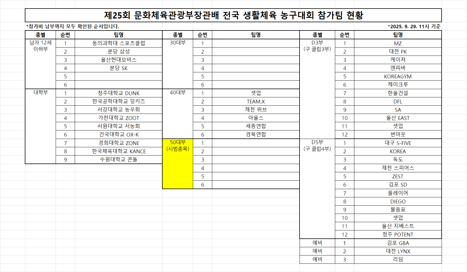 [안내] 제25회 문화체육관광부장관배 전국 생활체육 농구대회 신청현황 및 안내사항(25. 9.30. 16시 기준)