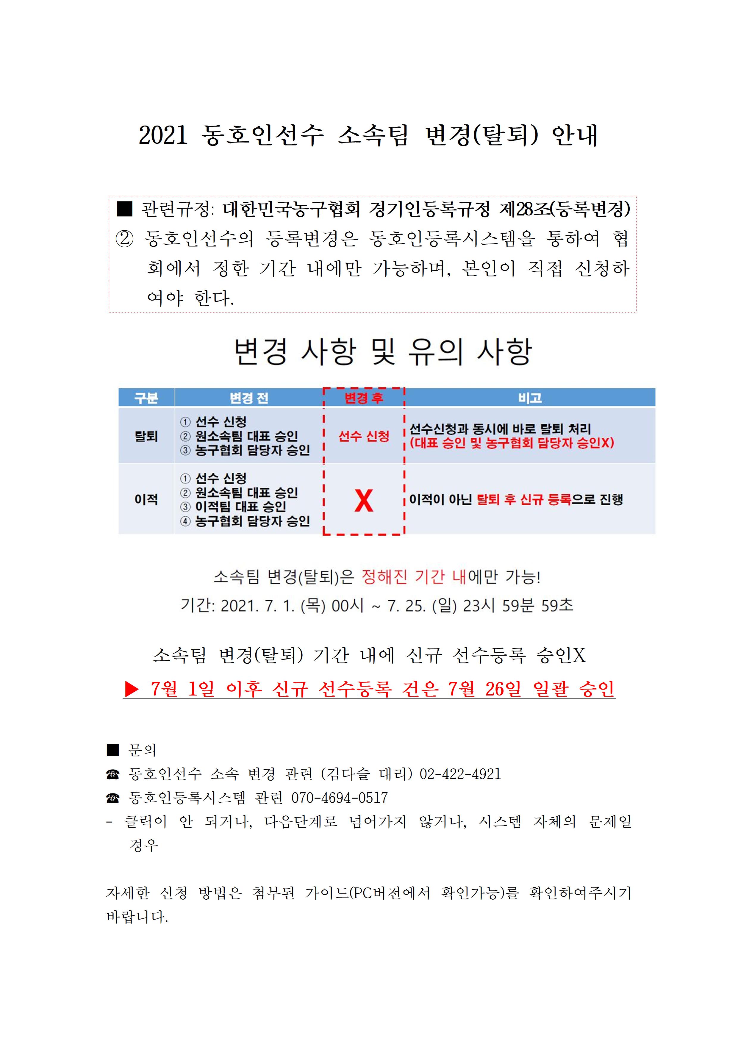 [안내] 2021 동호인선수 소속팀 변경(탈퇴)