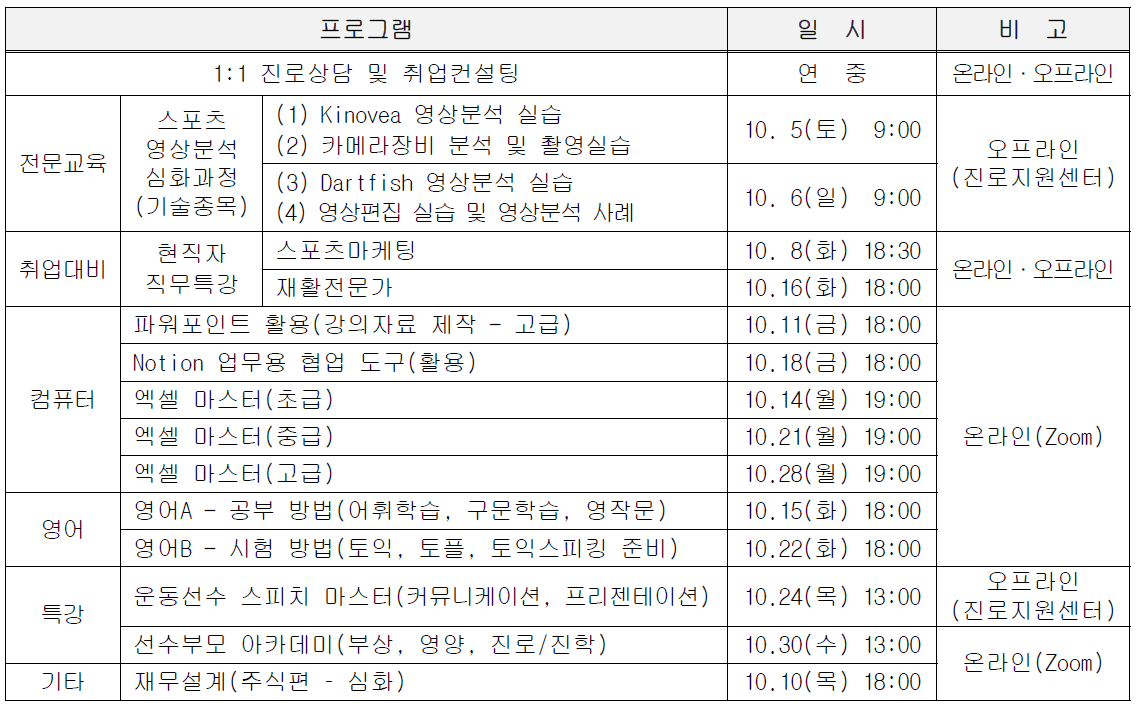 [안내] 대한체육회 진로지원센터 10월 교육 프로그램 작성일 2024-09-27 조회수 19169 페이스북 공유하기 대한체육회 진로지원센터 10월 교육 프로그램 안내 대한체육회 진로지원센터에서는 선수경력자를 위한 상담 및 교육 프로그램을 운영하오니 많은 관심바랍니다. □ 운영개요 ㅇ 2024년 10월 프로그램 일정(* 붙임 포스터 참고) ㅇ 참가대상: 선수경력자(은퇴·현역선수) * 대한체육회 선수등록시스템 기준 ㅇ 신청방법: 대한체육회 e진로지원센터(welfare.sports.or.kr)