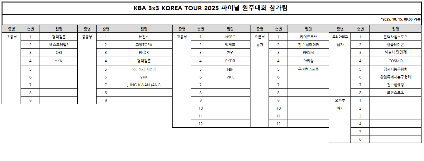 [안내] KBA 3x3 KOREA TOUR 2025 파이널 원주대회 참가 팀 현황(2025. 10. 15.) 작성일 2025-10-13 조회수 989 페이스북 공유하기 KBA 3x3 KOREA TOUR 2025 파이널 원주대회 참가팀 현황(2025. 10. 15.) 수시로 업데이트됩니다. 파이널 대회는 1~4차 지역 예선대회 입상팀을 대상으로 진행됩니다.(참가팀 부족 시 일반 참가팀 추후 모집 안내)