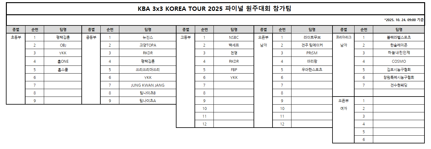 [안내] KBA 3x3 KOREA TOUR 2025 파이널 원주대회 참가 팀 현황(2025. 10. 24.) 작성일 2025-10-24 조회수 4173 페이스북 공유하기 KBA 3x3 KOREA TOUR 2025 파이널 원주대회 참가팀 현황(2025. 10. 24.) 수시로 업데이트됩니다. 파이널 대회는 1~4차 지역 예선대회 입상팀을 대상으로 진행됩니다.(참가팀 부족으로 인한 일반 참가팀 추가모집 中)