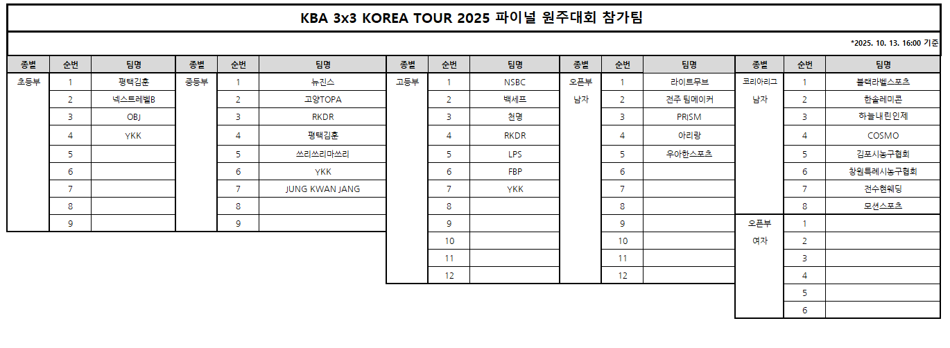 [안내] KBA 3x3 KOREA TOUR 2025 파이널 원주대회 참가 팀 현황(2025. 10. 13.) 작성일 2025-10-13 조회수 873 페이스북 공유하기 KBA 3x3 KOREA TOUR 2025 파이널 원주대회 참가팀 현황(2025. 10. 13.) 수시로 업데이트됩니다. 파이널 대회는 1~4차 지역 예선대회 입상팀을 대상으로 진행됩니다.