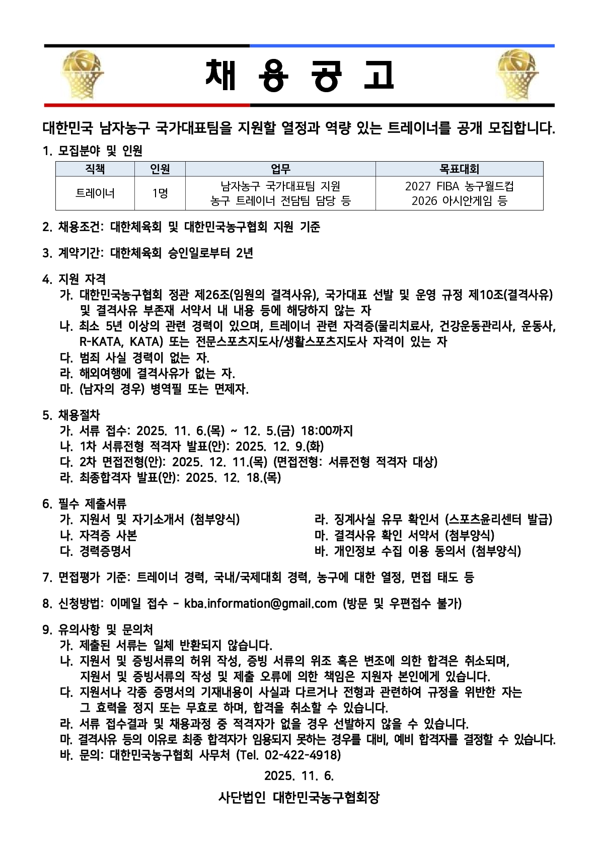 [공고] 대한민국 남자농구 국가대표팀 트레이너 모집 공고