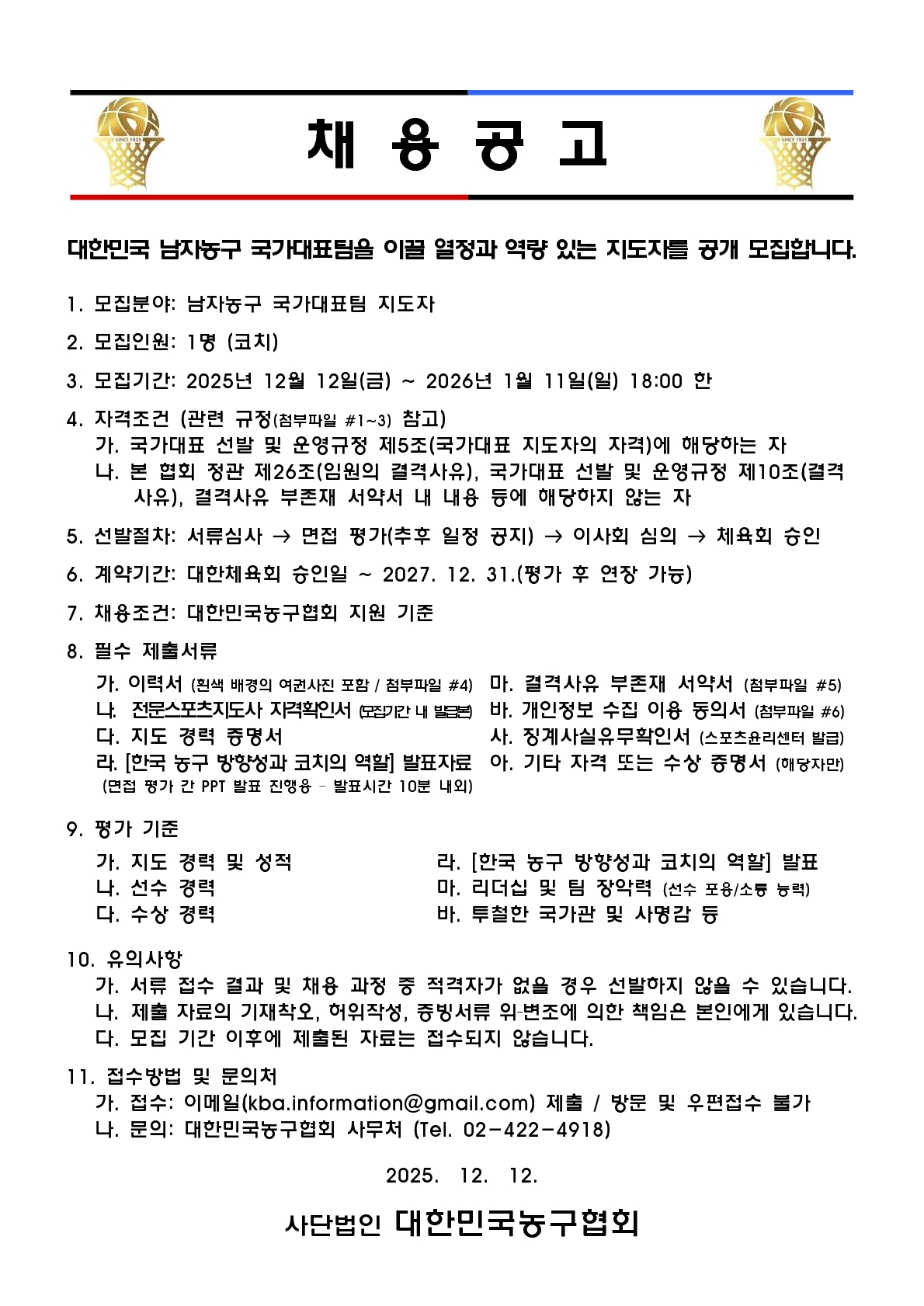 [채용] 성인 남자농구 국가대표팀 지도자(코치) 채용 공고