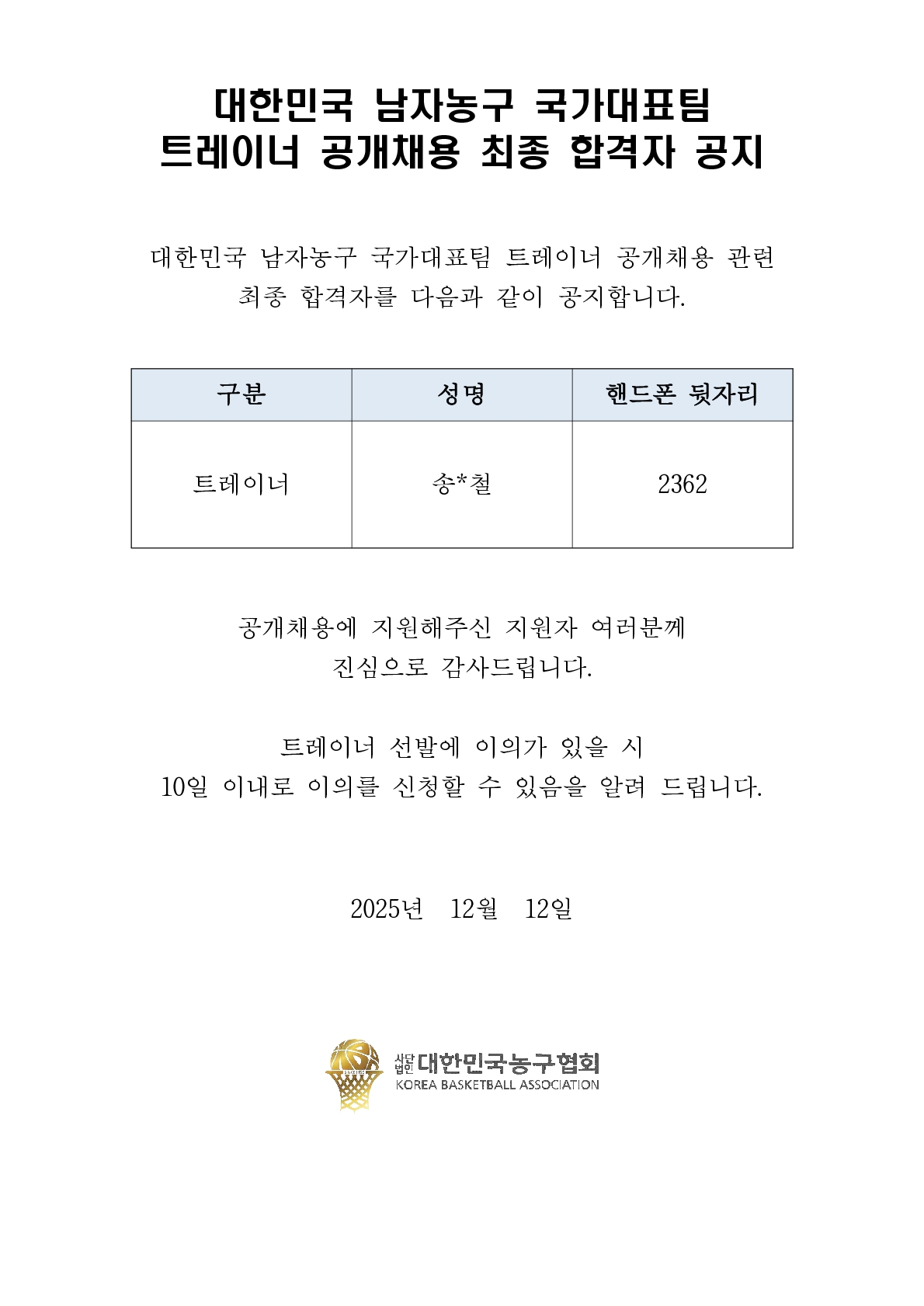 [공고] 트레이너 공개채용 최종 합격자 발표