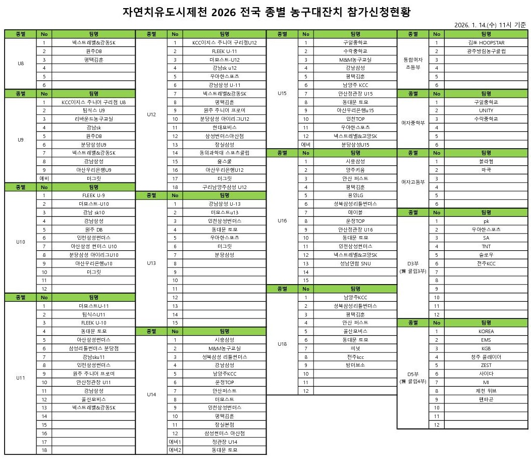 [안내] 자연치유도시제천 2026 전국 종별 농구대잔치 참가신청 현황 및 안내사항 (26. 1. 14. 11시 기준)