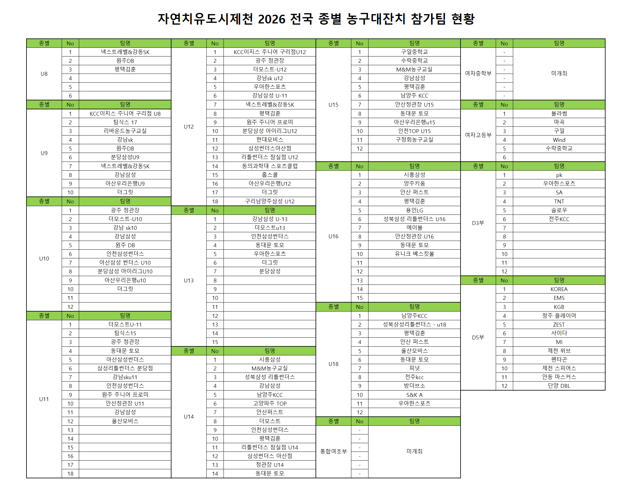 팀들의 원활한 경기 참여를 위하여 종별 경기 배정(안)은 1월 22일(목) 오전중으로 공지 예정이오니, 참고 부탁드립니다.