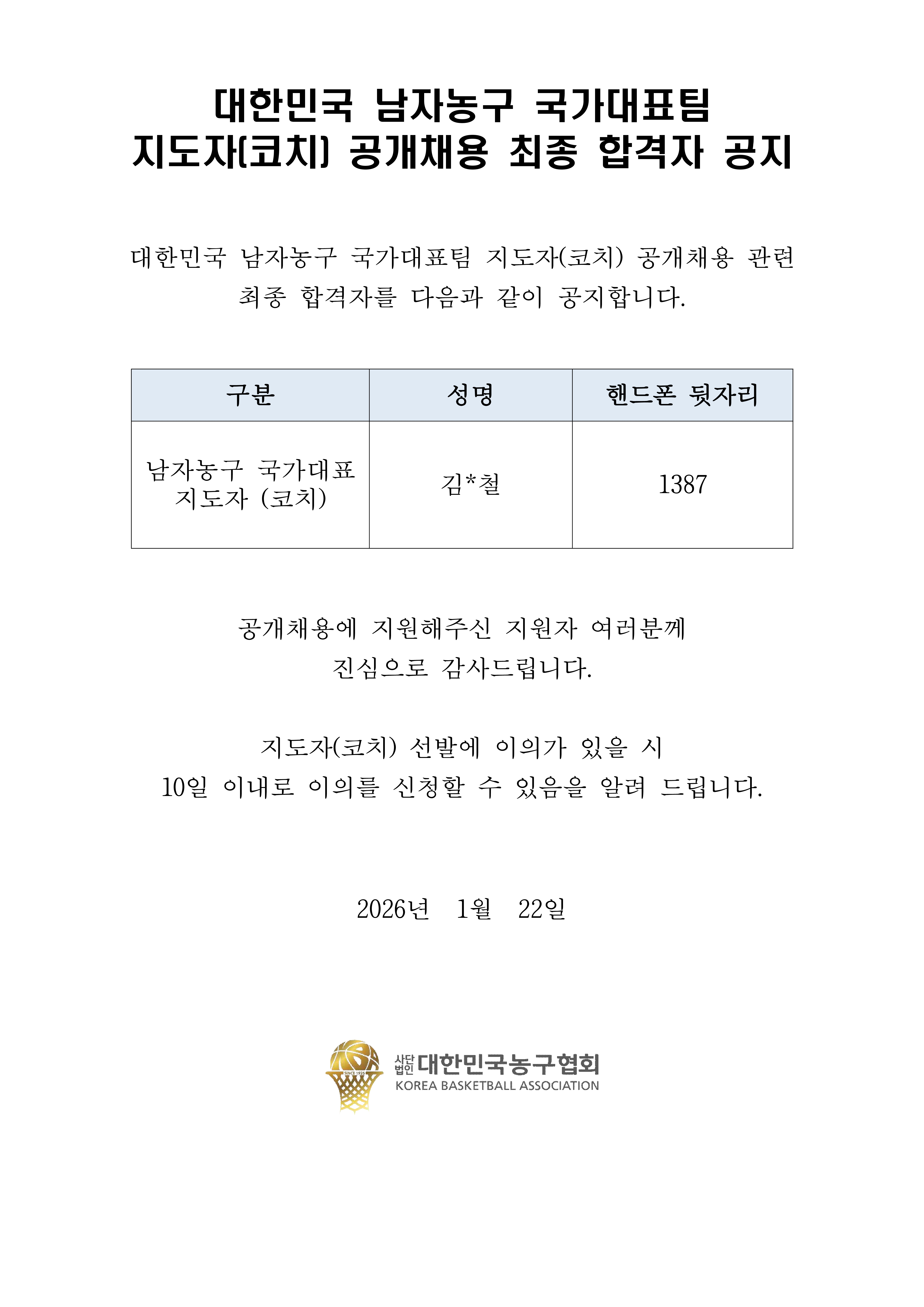 [공지] 성인 남자농구 국가대표팀 지도자(코치) 최종 합격자
