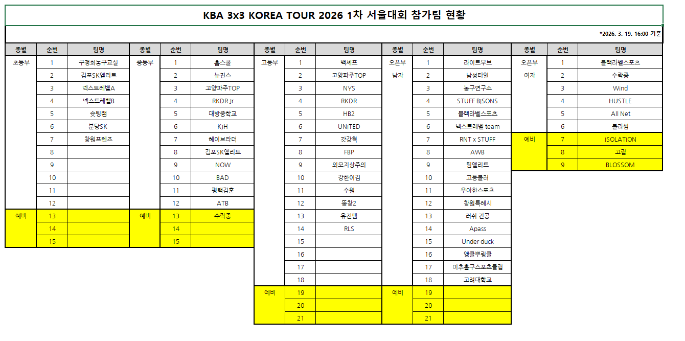 [안내] KBA 3x3 KOREA TOUR 2026 1차 서울대회 참가 팀 현황(2026. 3. 19.) 작성일 2026-03-13 조회수 1776 페이스북 공유하기 KBA 3x3 KOREA TOUR 2026 1차 서울대회 참가팀 현황(2026. 3. 19.)